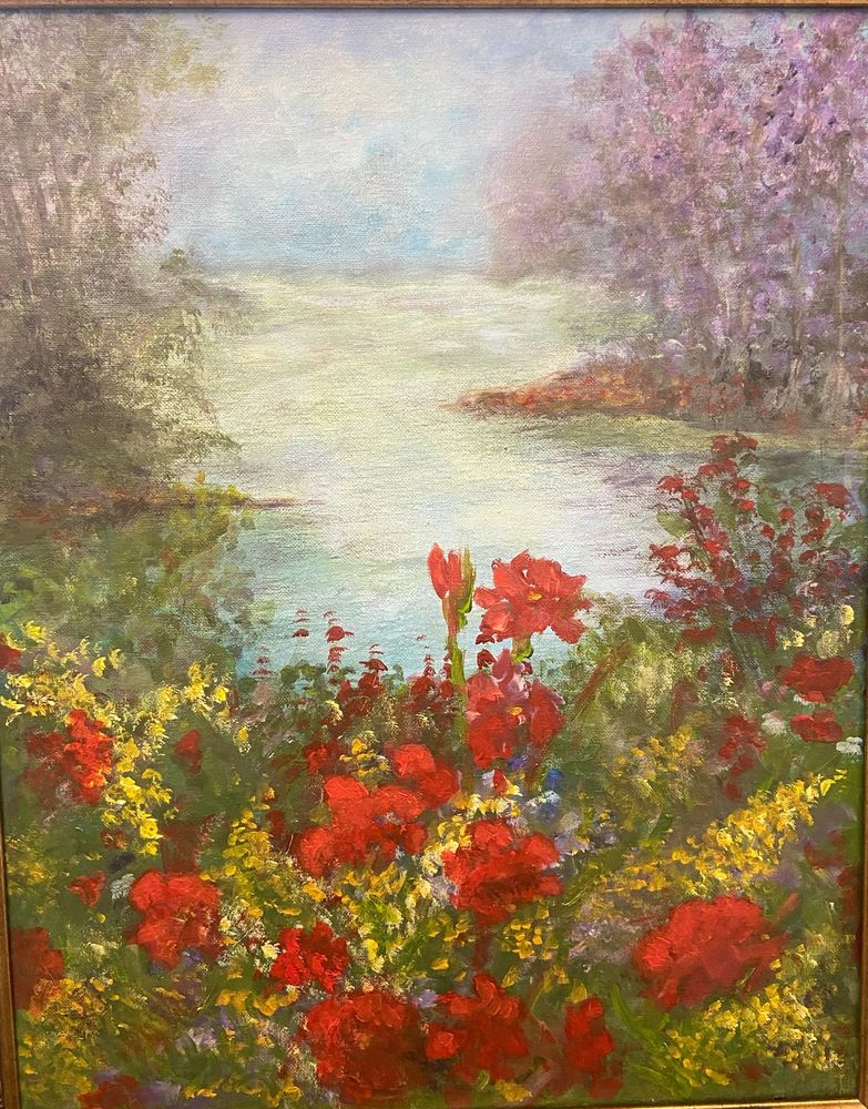 Nestled at the water’s edge, a garden blooms in rich crimson hues, nestled among yellow, blue, and soft lavender sprigs. The flowers mingle like a symphony of color, each hue dancing in harmony with the others. A tranquil lakeside scene unfolds beneath a soft sky. stretching across heaven’s canvas.